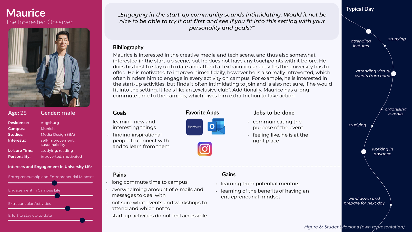 This customer journey, deprived from the prior research insights mirrors the current journey the students go through in context with their entrepreneurial journey at the university. Having an overview of the current state helps identify potential areas to improve in the future.